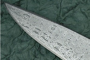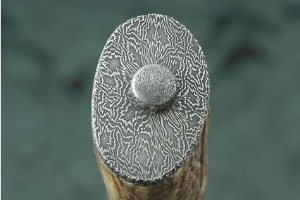 Blade: Large, highly detailed Damascus blade forged to shape from 1084 and 15N20 carbon steels