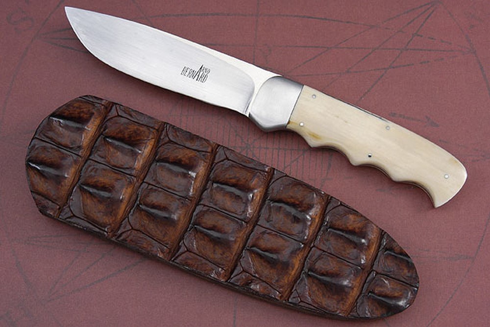 Description: This elegant mammoth ivory hunter by Arno Bernard has a dramatic South African feel and look. The mammoth ivory has been polished to a luster and is pinned with five stainless steel pins. The mammoth ivory shows off cream tones. Finger grooves result in a sure, comfortable grip. The blade has been differentially hand satin finished to accentuate the dramatic grind lines. As at home in a collection as out in the field. Excellent fit and finish throughout.