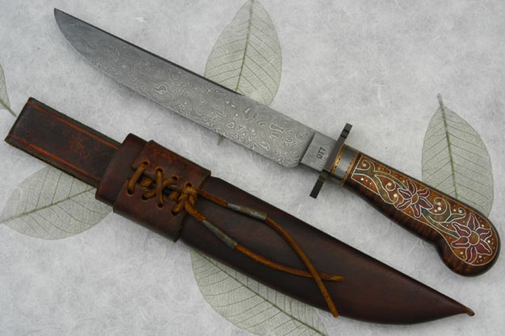 Description: An exceptional Bowie by Fred Ott! The slender blade has a long clip and immediate impact caused by the pool and eye pattern Damascus. A Damascus spacer and guard nicely compliment the blade. The handle is sculpted from curly maple and shows off tremendous skill. Fine silver inlay meticulously displays a floral scene. Differential dying of the maple results in green stems and warm toned petals. Tremendous fit and finish throughout!
