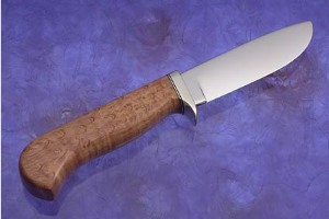 The 52100 carbon steel blade has an appleseed edge, which is preferred by many ABS Mastersmiths for its edge retention. The bird's eye maple handle is gently rounded and feels very comfortable in the hand. The fit and finish is excellent.