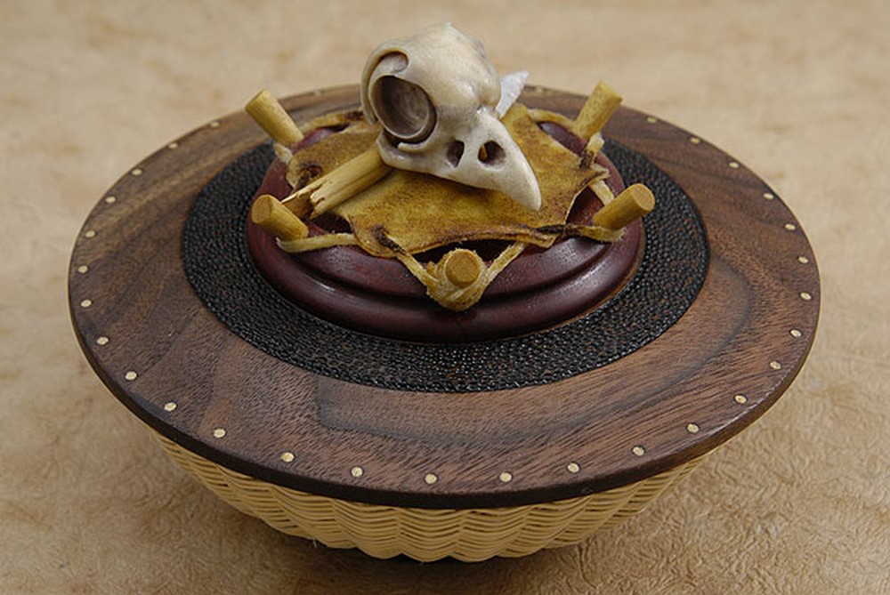 The basket has a turned rim and base of American black walnut and is woven in super-fine carriage cane. The lid is sculpted from Mayan bloodwood with yellowheart inlays. The owl skull was carved by Tom Sterling from polychromed moose antler. Tom's experience as a netsuke artist clearly shines through in this exciting piece. The arrow is pressure flaked Nevada chalcedony and has an ocean spray shaft. The basket measures 6 inches in diameter and measures approximately 4 inches. Exceptional work throughout.