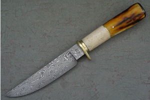 This hunter features a Damascus blade forged from 1080 and 15N20 carbon steels. A differential heat treatment is clearly visible and assures a supportive spine and ultra-hard edge. The blade has been distal tapered for a perfect balance. A brass guard is followed by a large oosic spacer and amber stag handle. Black fiber spacers allow the handle to adjust to changes in temperature and humidity. The handle is finished off with a buffalo horn pommel. Excellent fit and finish throughout.