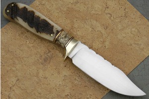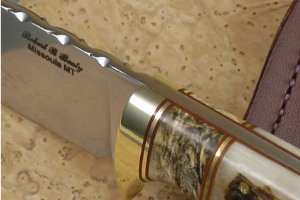 Description: This sturdy carbon tool steel blade is has a spine that is fileworked in the vine pattern and has a tapered tang for especially good balance. A cryogenic heat treatment to the dendritic D2 results in a blade that will have a particularly aggressive edge that won't quit. It was heat treated to Rc 59-60 (very hard), making a knife that will perform amazingly in the field. D2 has nearly enough chromium to be considered a stainless steel, but takes an incredible edge rarely found in stainless steels. Sheep horn scales are nicely offset by the buckeye burl and red fiber spacers. The fit and finish, along with the fileworked spine, make this a knife that will feel at home in a collection but is sturdy enough for use out in the field.