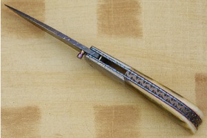 Description: This mammoth ivory gent's folder features a heat blued blade forged from carbon steels along with pure nickel. The resulting blade combines deep blues and purples with brilliant silvers in a bold Damascus pattern. The blade has been hollow ground for a keen, easy to maintain edge. It can be easily opened using ruby thumb stud. Fossil mammoth ivory scales are dovetailed to Damascus bolsters. The bolsters and scales are nicely domed for a very comfortable feel in the hand. Red fiber spacers allow the handle material to expand and contract to temperature and humidity changes. Titanium liners have been fileworked and differentially anodized. Silky smooth action and exceptional fit and finish throughout.