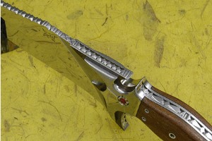Exactingly fileworked, sculpted and hammer-finished in his small shop in Villa Latina, Italy, his unmistakable style is most often characterized by a design with intense fileworking, sharpened shapes, blazing tongues and the pointed edges; all very much evident in The Piper’s Bowie.
