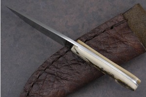 Description: This small mammoth ivory hunter by Arno Bernard has a dramatic South African feel and look. The mammoth ivory has been polished to a luster and is pinned with five stainless steel pins. The blade has been differentially hand satin finished to accentuate the dramatic grind lines. This piece is small enough so as not even to notice that it is with you, yet large enough to do hard work. A great piece for a collection or to use in the field.