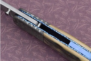 Description: While Arno Bernard is best known for his gentleman's hunting knives, every so often he puts his attention to a folder, and the result is exceptional. The Damasteel Damascus blade is very dramatic and will have excellent edge retention. A deep red faceted ruby is inlaid in the thumb stud. The blade has smooth action and is well centered. The bolsters are mosaic Damascus forged from carbon steels and depict an army of small spiders crawling toward the blade. Mammoth ivory has been dovetailed to the bolsters and sits on fully fileworked, blue anodized titanium liners. The ivory combines green and caramel tones. Titanium back strap helps keep the knife light and fast. Excellent work throughout on a very engaging knife.