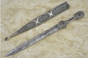 The blade of this magnificent presentation dagger is nothing short of what you would expect. Both renowned Damascus maker, Journeyman Gary House and knifemaker John Lewis Jensen collaborated on this masterpiece. The blade was begun by Gary House, who forged the complex mosaic Damascus blade. John Lewis Jensen then ground the blade to its final shape and heat treated the steel. The resulting collaboration is exceptional in its own right.