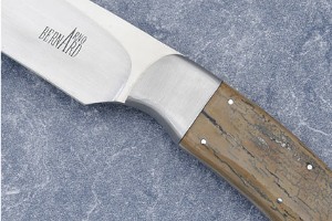 Description: This drop point hunter by Arno Bernard has a dramatic South African feel and look. The mammoth ivory on this hunter is particularly rare. The tusk was found in a silver mine. The tones found in mammoth ivory are a result of minerals close to the ivory under the ground. In this case, veins of silver run through the mammoth ivory bark to a truly wonderful and unique appearance. The ivory has been polished to a luster and is pinned with five stainless steel pins. The blade has been differentially hand satin finished to accentuate the dramatic grind lines. As at home in a collection as out in the field. Excellent fit and finish throughout.