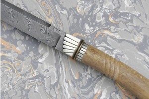 Description: An exceptional masterpiece by Fred Ott! This slender knife has tremendous presence and grace. The blade has a long swedge and has been distal tapered for optimal balance. This is accentuated by the thick spine (just under 1/4 inch!) at the ricasso. 1080 and 15N20 carbon steels have been combined into a tight twist pattern.