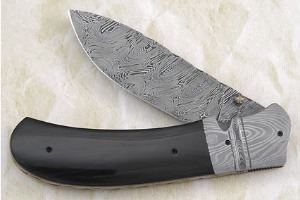 This large folder feels great in the hand -- with a comfort generally only found in fixed blade knives. The Twisted W’s pattern Damascus blade is just bold enough to be visible from a distance, but also complex enough to be fascinating when examined up close. The blade is easily opened using the fileworked thumb stud. The bold random pattern Damascus bolsters boast a linear accent which lends this substantial piece with a classic and elegant flair. Dovetailing assures a perfect fit between bolster and scale. The blade is well centered and has silky smooth action. Exceptional fit and finish throughout!