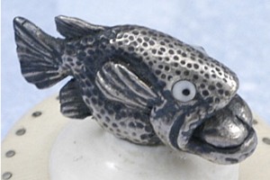 The basket is woven from .999 fine silver with sterling silver spokes. The rim and base are both sculpted from 20,000 - 40,000 year old mammoth ivory. The fish on the lid was meticulously sculpted from .999% fine silver. The eyes are formed from double inlaid fossil ivory and jet black buffalo horn. This technique clearly shows Tom's experience as a netsuke artist. The eyes have a vivid, lifelike appearance. The basket measures approximately 1 1/4 inch in diameter and just over 1 1/2 inch in height. Exceptional work throughout and sure to be a cherished possession for either a basket or netsuki collector.