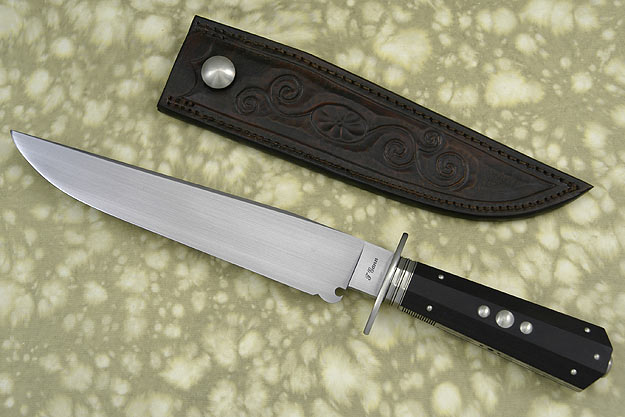 Description: Journeyman Smith Tommy Gann makes an exceptional Bowie. The blade was forged to shape from 52100 carbon steel. A hand rubbed satin finish creates an elegant, heirloom quality. The blade features a long clip and is distal tapered for balance. The cutting edge is finished off with a Spanish notch.