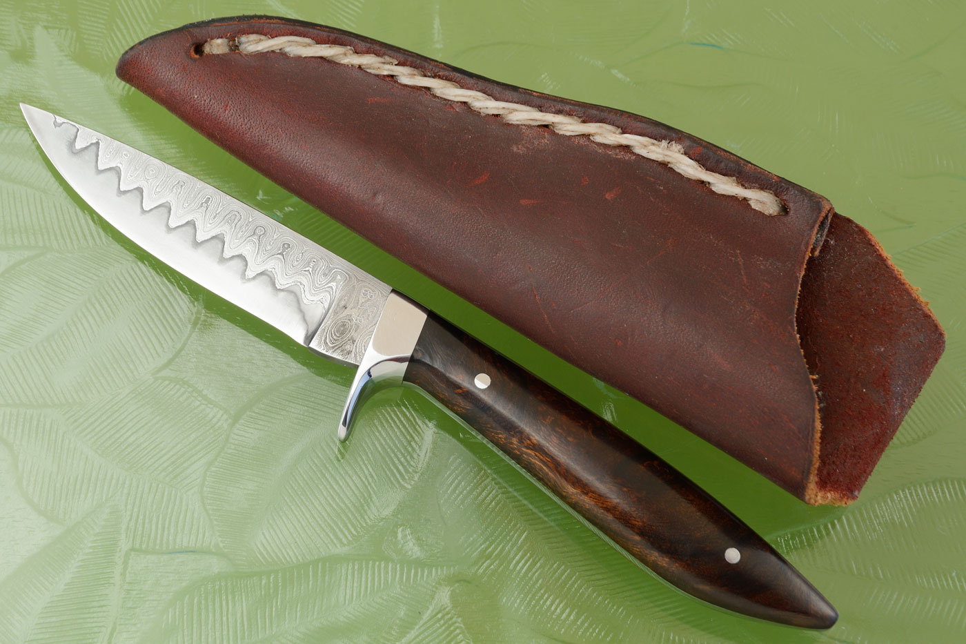 A stainless steel guard separates the san mai blade from the desert ironwood handle. The handle has been well contoured to fit comfortably into the hand in a variety of holds. A distal taper to both blade and tang ensures a perfect sense of balance.