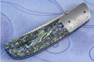 Description: South African knifemaker George Muller creates an exceptional knife at a remarkably low price. The hollow ground blade and bolsters are formed from stainless Damasteel damascus, for a long lasting and easy to maintain edge. The pattern is immediately captivating and is nicely complimented by the precision grind lines. The spine has been fileworked in a twist pattern. Abalone scales are dovetailed to the Damascus bolsters for a perfect fit. Blue anodized and fileworked titanium liners keep the knife light and very strong. An exceptional find!