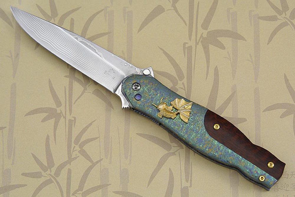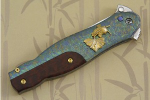 The scales, backbar and liners are formed from hand textured and differentially anodized titanium (both inside and out). The left side features a safety-button release, which allows the blade to be opened. A gold plated koi "swims" in the textured titanium of the left side. Gold plated screws are used throughout.