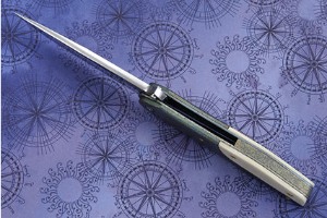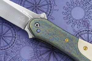 The scales, backbar and liners are formed from hand textured and differentially anodized titanium (both inside and out). Purple, blue, green and gold tones are intermixed. The left side features a blue anodized safety-button release, which allows the blade to be opened. Both sides feature inlays of mammoth ivory. Gold plated screws are used throughout. Excellent fit and finish with silky smooth action.