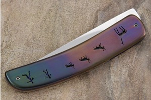 Description: The Petroglyph is a hallmark of South African knifemaker Theuns Prinsloo's work. Here, Petroglyph images are cut out of stainless steel. This is then electro chemically colored for a dramatic rainbow effect. This slick folder will feel equally at home as a daily carry or in a cherished collection.