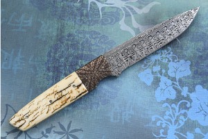 Description: This gent's dress hunter features a blade formed from Damasteel stainless damascus. The bold pattern is immediately captivating. Mammoth ivory scales and mosaic damascus bolsters are set on a distal tapered full damascus tang. The mammoth ivory is predominantly cream toned with chocolate veins. The knife is accompanied by a presentation sheath made by Larry Parsons. Exceptional fit and finish throughout!