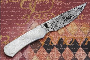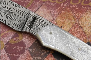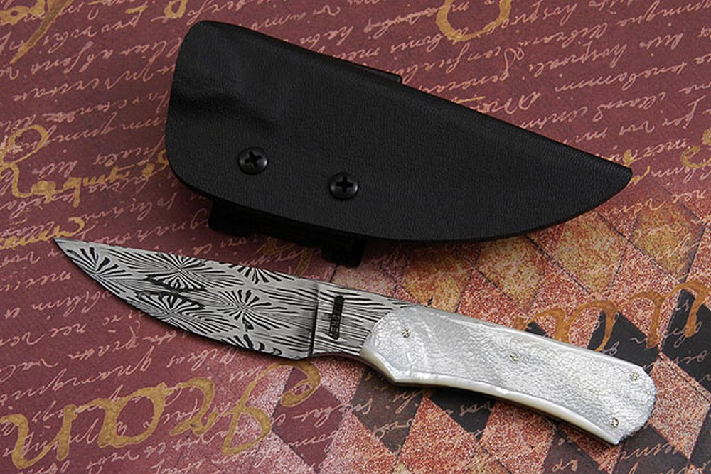 Description: Mastersmith Ed Caffrey created the EBK as a neck knife that could be carried every day. The compact size and light weight makes it convenient, while the blade is large enough to get most any job done well. This presentation EBK is exceptional -- from high contrast mosaic damascus blade to the carved and textured whitelip mother of pearl handle.