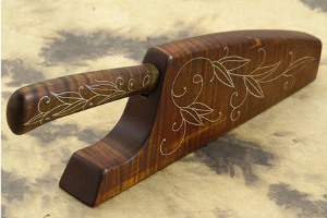 The handle and stand are both formed from curly maple and have been decorated with fine silver inlay. Vines and leaves traverse the surface. An antiqued bronze bolster completes the handle. The presentation stand has been nicely weighted for a secure, stable base. Tremendous fit and finish throughout!