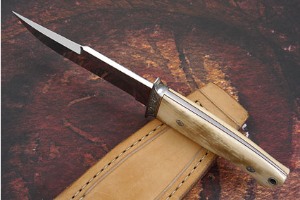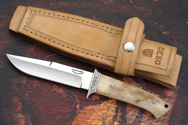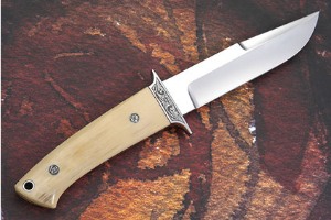 The stainless steel blade was hollow ground to accentuate the dramatic grind lines. By using CPM154CM powdered metallurgical stainless steel, Alain assures a keen, long lasting edge. The guard is formed from 416 stainless steel and has been meticulously hand engraved by Bruce Bradshaw. The full tang assures a durable construction. A distal taper to both blade and tang results in perfect balance. Red fiber spacers assist the ivory to adjust to temperature and humidity changes. The handle has been nicely shaped for a very comfortable, secure grip. Both pins have been engraved to match the guard. Exceptional work throughout.