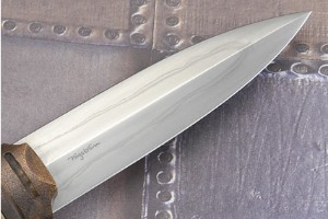 Musk Ox Dagger features a 1050 carbon steel blade that was created using a traditional Japanese clay heat treatment technique. The artful hamon (temper lines) show the transition between a soft central spine and keen, hard cutting edge.
