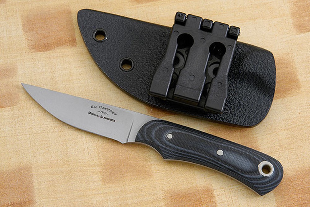 The 13C26 stainless steel blade has a non-reflective, bead blasted finish. A hollow grind assures a keen, long lasting edge that is easy to re-sharpen. The spine has been rounded for comfort. G10 handle scales will hold up exceptionally well out in the field or in an executive's pocket. Accompanied by a Kydex sheath. Excellent fit and finish throughout.