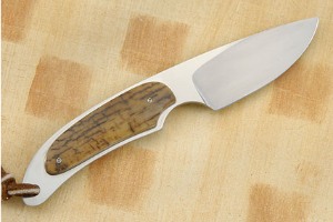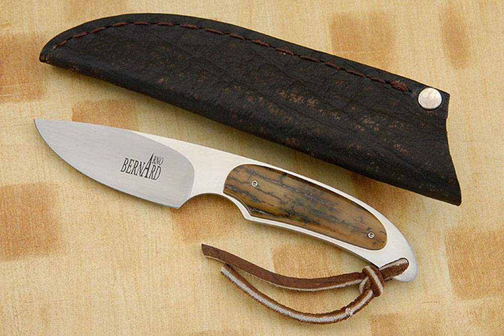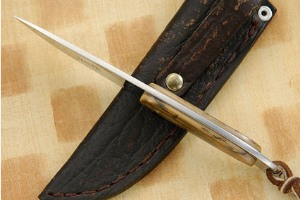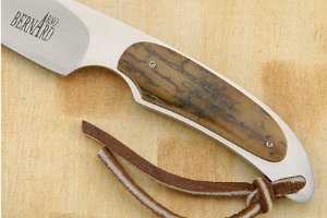 Description: This gent's hunter has a dramatic South African feel and look. Mammoth ivory scales are set on a full tang, assuring strength and durability. The ivory combines cream and caramel tones. The blade is satin finished in the hollow grind and mirror polished on the flats. This accentuates the dramatic grind lines. This piece is small enough so as not even to notice that it is with you, yet large enough to do hard work. A great piece for a collection or to use in the field.