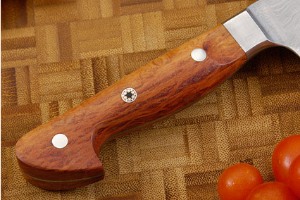 The handle was formed from stabilized rare sheoak burl wood. A single piece of wood was cut so as to have the wood's complex grain pattern travel across the tang. The wood has a fascinating, convoluted grain pattern that nicely reflects the suminagashi pattern of the blade and bolsters. The handle is profiled so as to be very comfortable and provide a secure hold. Two hidden bolt rivets and a complex mosaic pin secure the scales to the tang. The rivets are stainless and have been profiled to match the wood. The mosaic pin combines stainless steel with copper. This knife feels as good as it looks.