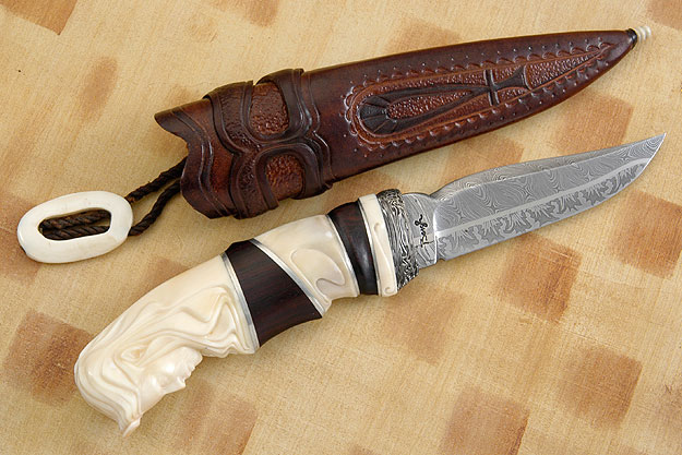 The handle combines cocobolo with warthog tusk. The tusk has been carved in art nouveau style into a Viking prince. The face has tremendous lifelike personality, with a natural appearance and long flowing hair. Surprisingly for such a heavily sculpted knife, the handle is extremely comfortable and fits perfectly into the hand. The price was carved by Roger's son, Isak Bergh. Unfortunately, Isak rarely has time these days for these collaborations which are among Roger's most desirable work. As you would expect, the fit and finish are exceptional and the impact tremendous.