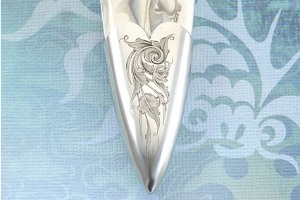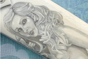 Lee teamed up with artists Mary Austin Tally and Steve Lindsay to complete the sheath. The sheath itself, made by Lee, is formed from two section of well matched, pristine ivory. The scrimshaw, designed and executed by Mary Austin Tally, is a finely detailed nude gazing directly at the viewer, hair tumbling over her bare shoulders. The design was done at 20x magnification with metallic paint. Steve Lindsay's floral scrollwork on the nickel silver throat surrounds an abalone-inlaid frog, and matches the scrollwork on the tip. Both are simply exquisite, complementing the scrimshaw and overall design of the piece perfectly.
