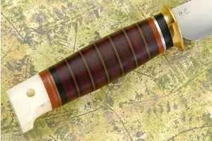 Handle: Stacked leather handle with copper, stainless steel, black and red fiber spacers and an ancient walrus ivory pommel