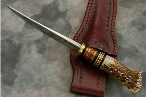 This bird and trout is very true to Scagel's design from the carbon steel upswept blade to the leather handle with stacked spacers. Doug chose to follow the color themes used by Scagel, combining leather with steel, copper, brass, and red and black fiber spacers. The front guard and pin are formed from bronze. A stag crown pommel, almost all of the natural texture left intact, completes the handle, with the handle pin hammer-finished to match. The resulting handle is classically stylish and extremely comfortable. The front of the bronze guard has been beveled and fits perfectly to the 1084 blade. A hand satin finish lends an heirloom quality. The fit and finish throughout is exceptional.