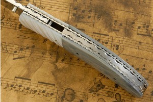 The blade is hollow ground S-35VN powdered metallurgical stainless steel. The keen edge will stay sharp exceptionally well! The blade has smooth action and is easily opened with one hand using the sterling silver thumb stud.