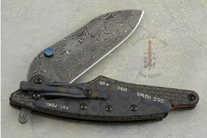 High tech scales are machined from extremely rare lightning strike carbon fiber and flame anodized titanium. Copper strands move through the woven carbon fiber. This type of carbon fiber was originally designed for use on fighter jets to redirect electricity. Lightning strike carbon fiber is among the hardest to find of knifemaking materials. When the flipper is pressed, the lower section of the frame moves back and forward in a unique motion controlled by a silicone rubber bungee. Though the mechanism does not lock, when your finger rests in the choil, it holds the blade open. This is clearly a design that could have only been created by the Hawks' genius!