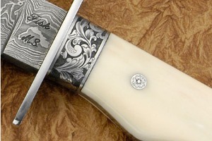 This exceptional Bowie shows off Jerry's work at its best. The 9 inch long, broad blade was forged to shape from Jerry's Dog Star pattern damascus, beginning with 15N20 and 1084 carbon steels. The radiating pattern is immediately captivating. The left ricasso is marked "Fisk/M.S." A satin finished oval guard separates the handle from the blade. The 416 stainless steel ferrule is meticulously engraved in Western Scroll by Jerry. The base is engraved "NLT #10 '04". Pristine ancient walrus ivory scales are set on the full tang. Stainless rivets are engraved in matching style. The knife is accompanied by a hand tooled leather sheath by Kenny Rowe. Exceptional work throughout!