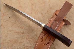The blade was forged to shape from W2 carbon steel. Using traditional Japanese techniques, Gary performed a clay zone heat treatment. By insulating the spine with clay, the spine remains soft and supportive of the ultra-hard, keen cutting edge. The undulating heat treatment line is called a hamon. The handle is carved from cocobolo. It is completed with domed nickel silver pins.