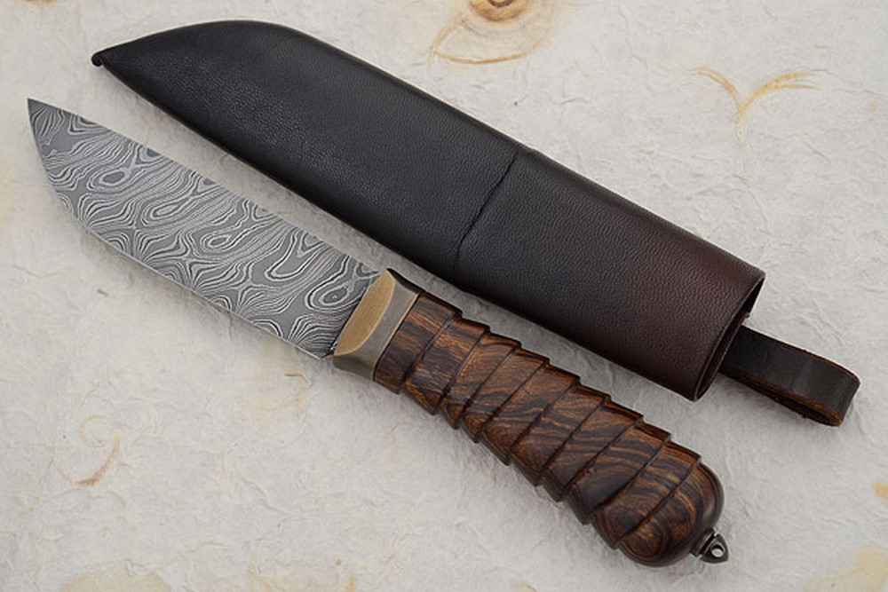 Blade: Twist pattern damascus forged from 1080, L6, O1, and 15N20 carbon steels
