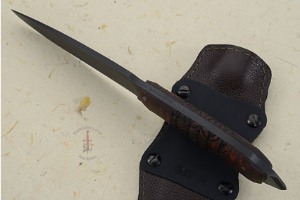 As a conventional knife, the Spike is made from 3/16" 80CrV2 carbon steel with a non-glare Caswell finish. The drop point design means that the blade's energy is centered, thus minimizing drift. Handle contours make it possible to comfortably reverse grip when utilizing the spike for its intended uses. Dyed curly maple scales provide a sure, comfortable, non-slip grip. Tribal markings both provide visual interest and a sure grip. The handle is finished with a spike, integral to the tang.