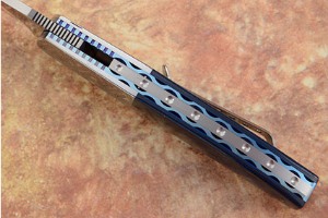 Handle: Polished blue G10 and black carbon fiber with inlaid stainless pocket clip