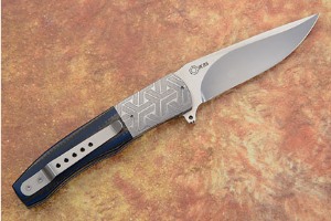 The scales combine thinly stacked layers of blue G10 and thick weave carbon fiber with mirror polished 303 stainless steel bolsters that are hand textured. By shaping the scales Andre creates a unique and attractive elongated chevron pattern that is handsomely complemented by the geometric patterning of the bolsters. Jimping on the thumb ramp ensures a secure grip. The flipper doubles as a front guard that keeps the hand from sliding forward onto the blade. The gently rounded handle feels sturdy and fills out the hand perfectly. The handle is completed with fileworked titanium liners that have been differentially anodized in blue tones. The stainless steel pocket clip is mounted for tip-up carry.