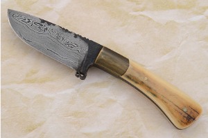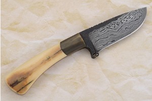 Orvis chose a hunter for their third limited edition. The blade is 384 layer damascus forged to shape from 15N20 and 1084 carbon steels. It sports a finger guard with a decorative forged curl - a well-known Winkler hallmark. The handle scales are ancient mammoth ivory, which is up to 50,000 years old. Each piece is absolutely unique in that the coloration varies due to the result of thousands of years of exposure to the minerals in ice and soil of the frozen tundras of Alaska and Siberia. The bolster is antiqued brass. Decorative filework adorns the spine and acts as a thumb rest.