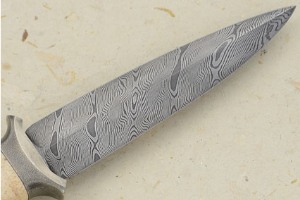 The blade is a twist pattern damascus that he forged from 15N20 and 1080 carbon steels. It is a nice mix of fine and bold patterns. The offset dagger-shaped blade is fully sharpened on both sides.
