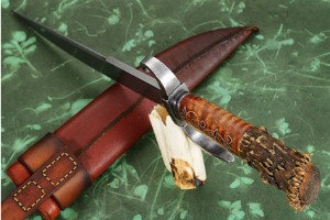 The knife is accompanied by a basswood sheath, wrapped in goat skin. It is ornamented with a mule deer tine. Exceptional work throughout!