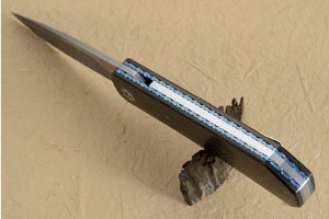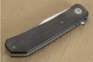 Carbon fiber scales are set on anodized, hand fileworked titanium liners. Stainless steel back spacer.