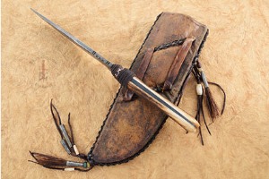 Antiqued elk antler scales are set on a distal tapered full tang. A distal taper to both blade and tang ensures perfect balance. The handle is completed with a patterned copper ferrule and leather wrap.