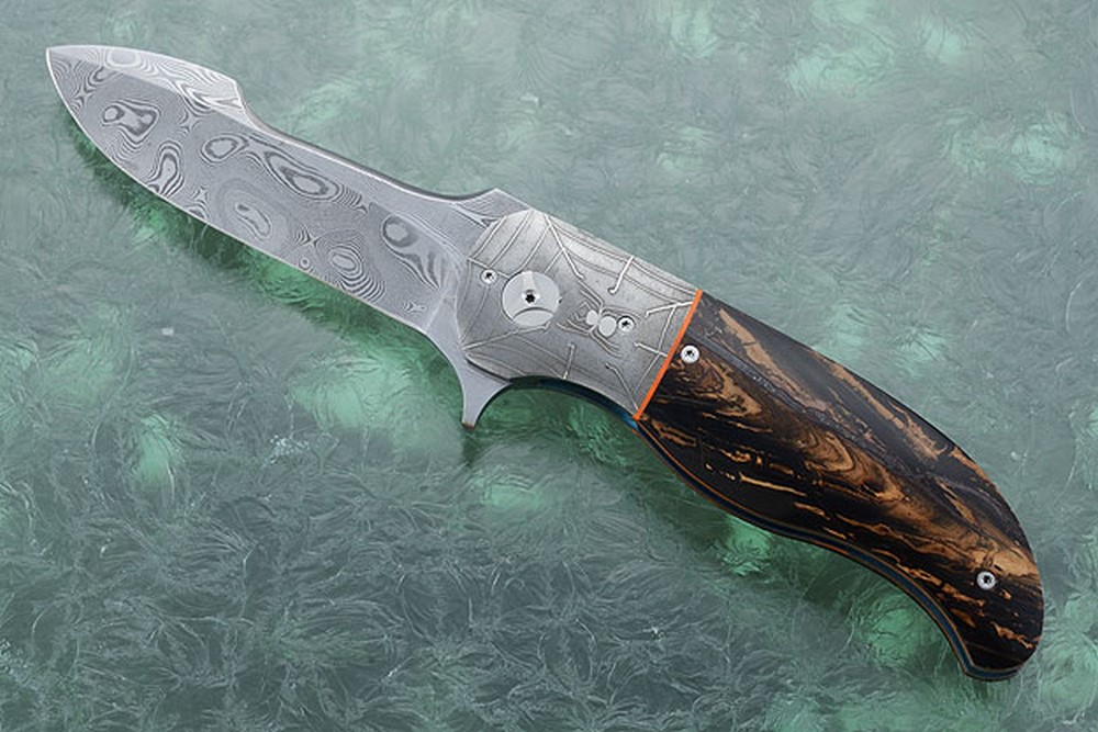 The swayback blade is formed from high performing damascus by Damasteel, Sweden. The bolsters are formed from Doug Ponzio mosaic damascus and depict a detailed spider laying in wait in its web.