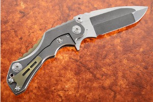 The handle is solid titanium with milled finger areas for a comfortable, no-slip grip, with a differential (stonewashed and satin) finish and anodized titanium back spacer. The thumbstuds, pivot, handle, and pocket clip screws are all a matching satin finish. It's fast, tactical, beautiful and a great knife for any collection. Anodized pierced titanium pocket clip is mounted for tip-up carry.