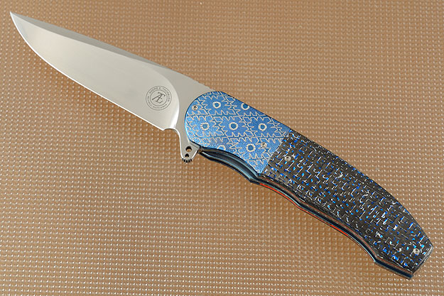 The scales are blue/silver carbon fiber. Jimping on the thumb ramp provides a comfortable, secure grip. The gently rounded handle feels sturdy and fills out the hand perfectly. Engraved, differentially anodized titanium bolsters provide a steadfast grip that is also very beautiful. Titanium liners sit against red fiber spacers and have been fileworked and anodized. A G10 backspacer helps keep the knife light. The pierced titanium pocket clip is mounted for tip-up carry.